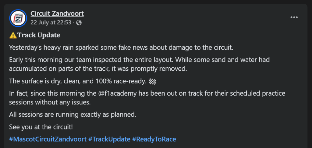 In reality, their cited Dutch source clearly and accurately stated that the circuit sustained “no structural damage”. The incident was limited to an overflow from the circuit’s primary catchment area, which was quickly managed by diverting excess water into a dedicated overflow reservoir.