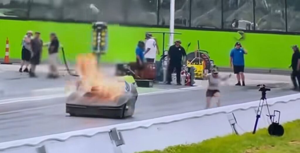 Blaney’s ’63 Corvette reportedly suffered a catastrophic engine explosion shortly after completing a burnout. As the car was backing up on the return path, it suddenly erupted into flames, prompting an immediate response from track safety crews.